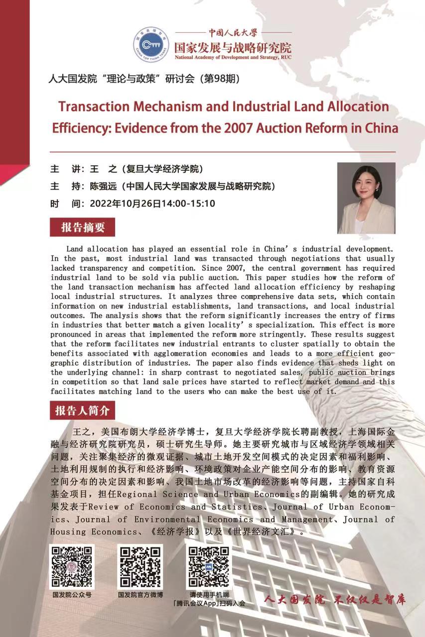 摘要:Land allocation has played an essential role in China’s industrial development. In the past, most industrial land was transacted through negotiations that usually lacked transparency and competition. Since 2007, the central government has required industrial land to be sold via public auction. This paper studies how the reform of the land transaction mechanism has affected land allocation efficiency by reshaping local industrial structures. It analyzes three comprehensive data sets, which contain information on new industrial establishments, land transactions, and local industrial outcomes. The analysis shows that the reform significantly increases the entry of firms in industries that better match a given locality’s specialization. This effect is more pronounced in areas that implemented the reform more stringently. These results suggest that the reform facilitates new industrial entrants to cluster spatially to obtain the benefits associated with agglomeration economies and leads to a more efficient geographic distribution of industries. The paper also finds evidence that sheds light on the underlying channel: in sharp contrast to negotiated sales, public auction brings in competition so that land sale prices have started to reflect market demand and this facilitates matching land to the users who can make the best use of it.