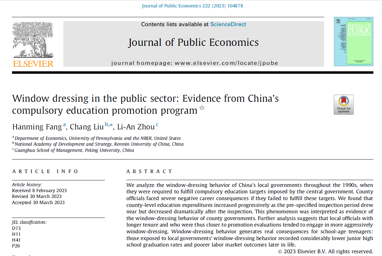发布时间:2023-05-09近日,我院刘畅老师与宾夕法尼亚大学方汉明教授和北京大学周黎安教授合作的论文Window Dressing in the Public Sector: Evidence from China’s Compulsory Education Promotion Program发表于公共经济学顶级期刊Journal of Public Economics。该论文以上世纪90年代“两基”督导评估为背景,研究了地方政府面临一次性强激励时可能出现的机会主义行为。该研究的结论具有十分重要的政策含义,为了遏制地方政府面临强激励时出现机会主义行为,有必要采取多次随机抽查而不是一次性检查验收的方式对其进行监督和考核。