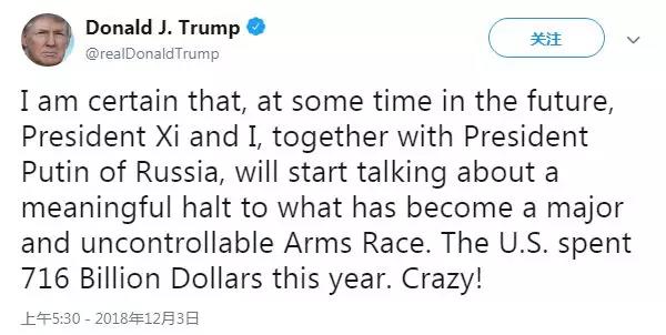 特朗普说,自己确信,未来中俄两国领导人将与他一起探讨如何削减军费,以中止“失控的军备竞赛”。