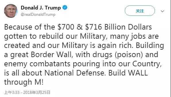 特朗普在3月发的一条推特与最近发的这一条形成了鲜明对比。当时他不无自豪地说:“我们连续投入了7000亿和7160亿美元来重建军队,这带动了许多就业岗位,军队又有钱了!”