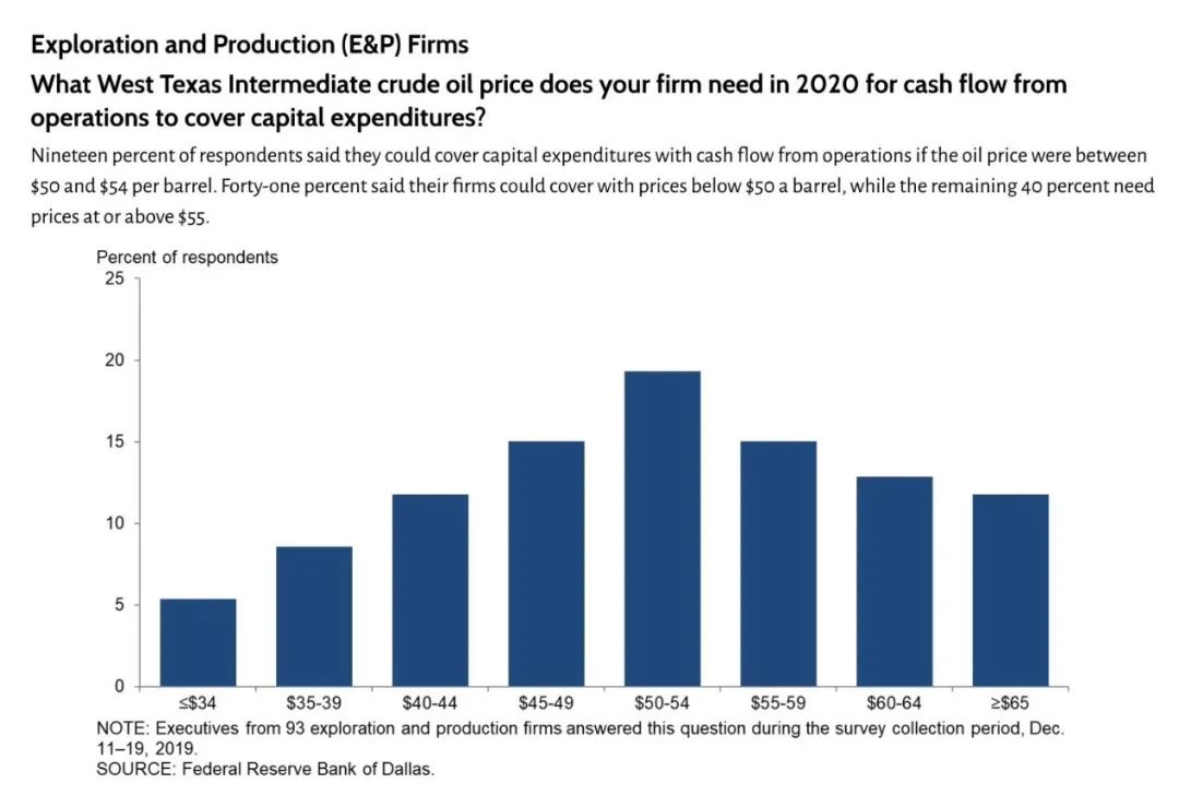 表1简单归纳了影响三大产油国之间相互博弈的可能核心因素。从沙特来说,主要是要原油销售地盘,要赚钱,成本低,打价格战有底气,同时手中握有选择石油计价货币的权力。对俄罗斯来说,再苦也扛,强硬而且有部分稳定的市场带来的底气。对美国来说,是最后一个加入原油生产“三巨头”的。一方面通过页岩油实现了能源自给,也减少了过去大量原油进口每年2000亿、甚至3000亿美元的贸易逆差问题,也增加了国内的就业岗位。但无奈和沙特、俄罗斯原油成本比起来,美国页岩油的开采成本还是硬伤。美联储达拉斯分行的2019年年底的调查研究也证实这一点(图2)。