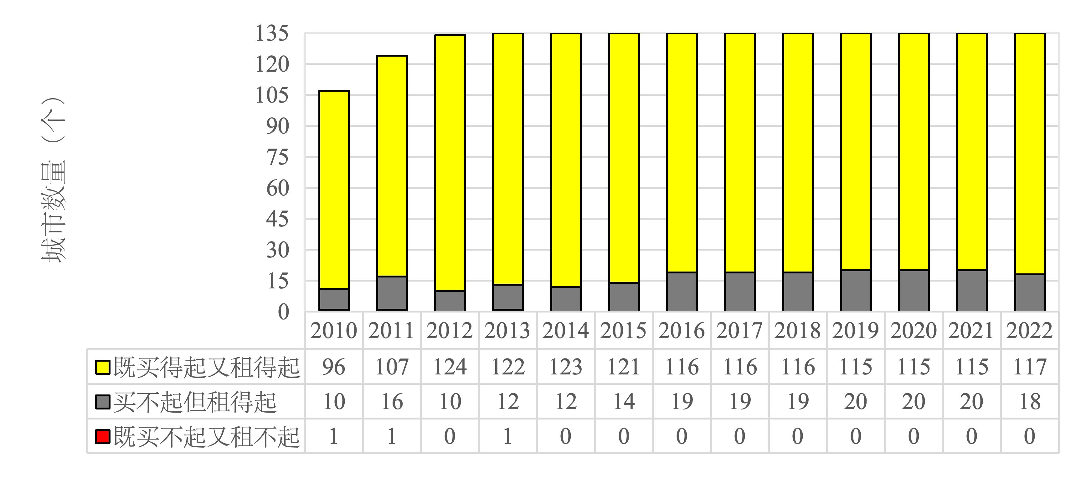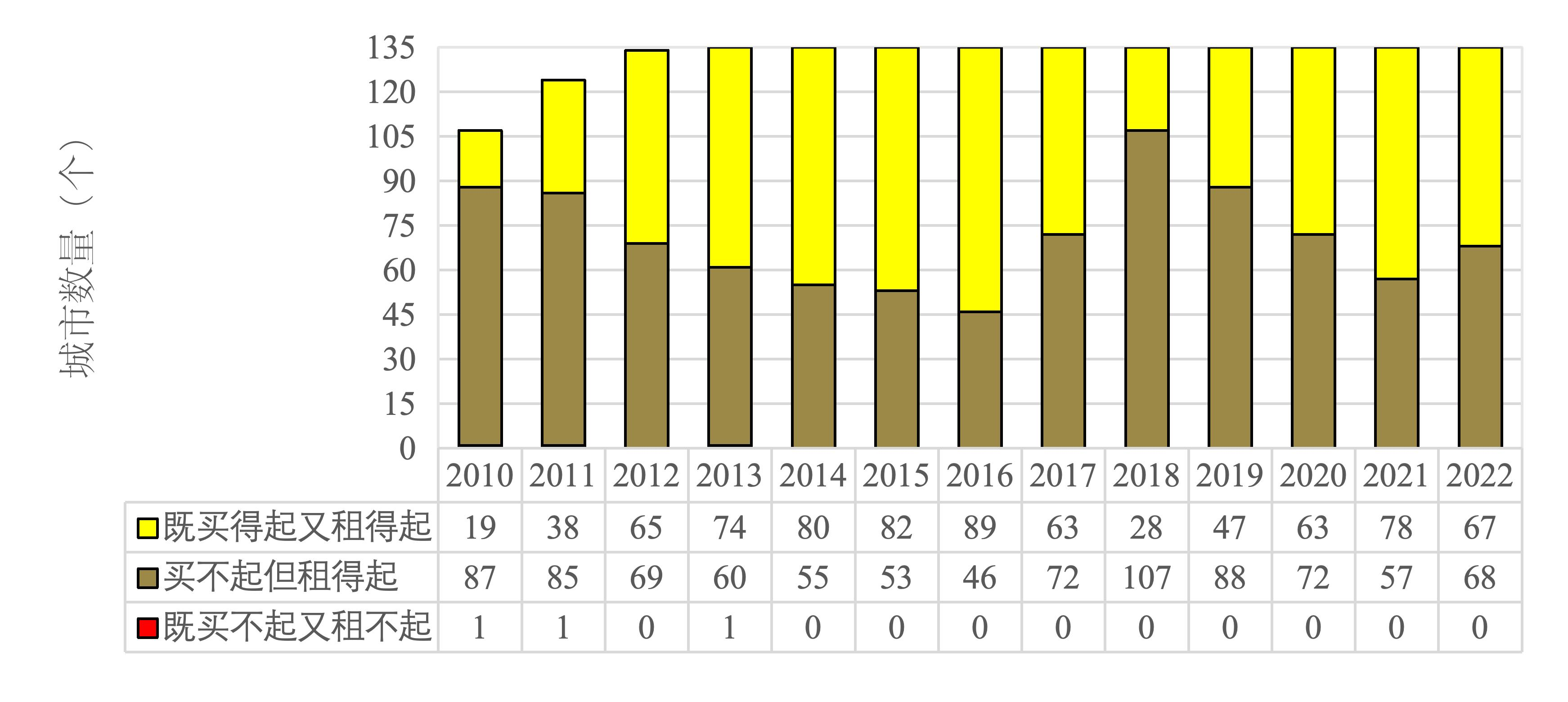 四、2010-2022年中国135个大中城市住房可支付指数联合分布:中低收入者几乎不存在既买不起又租不起情形