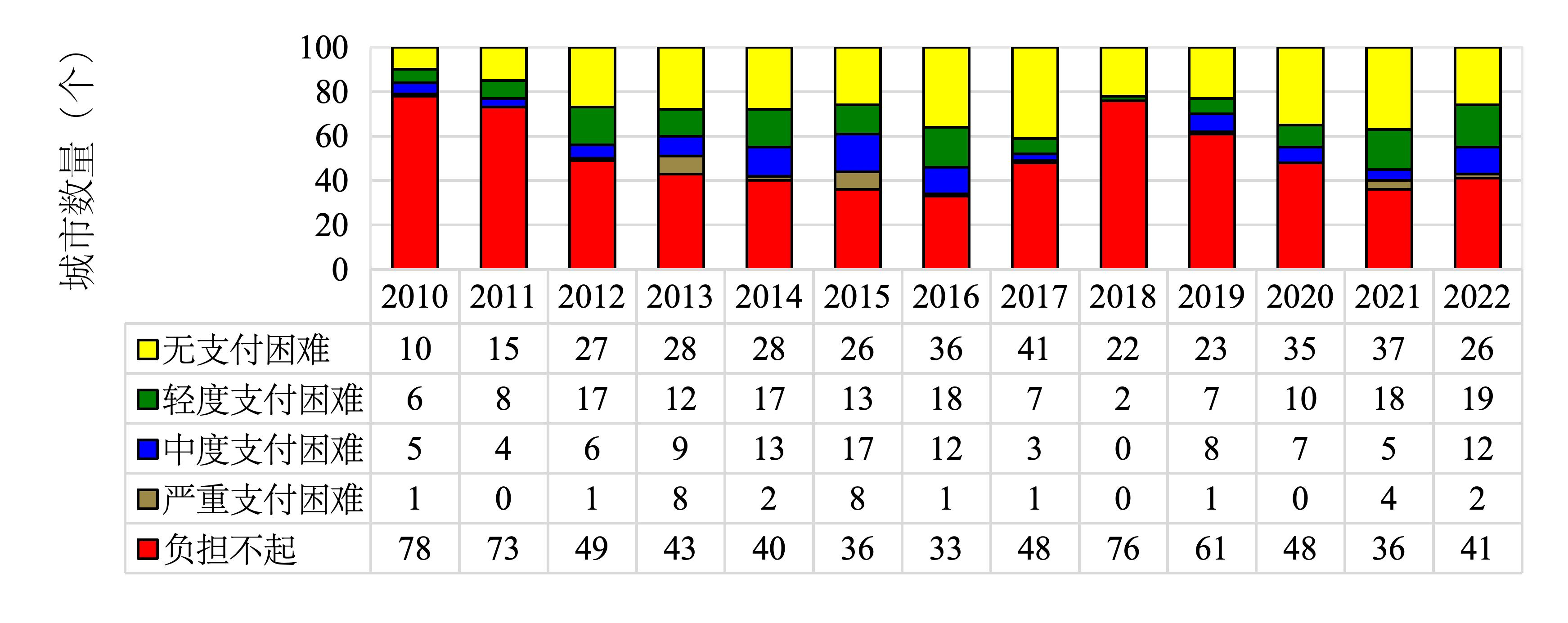 图5 2010-2022年100个三线城市房租可支付性分布
