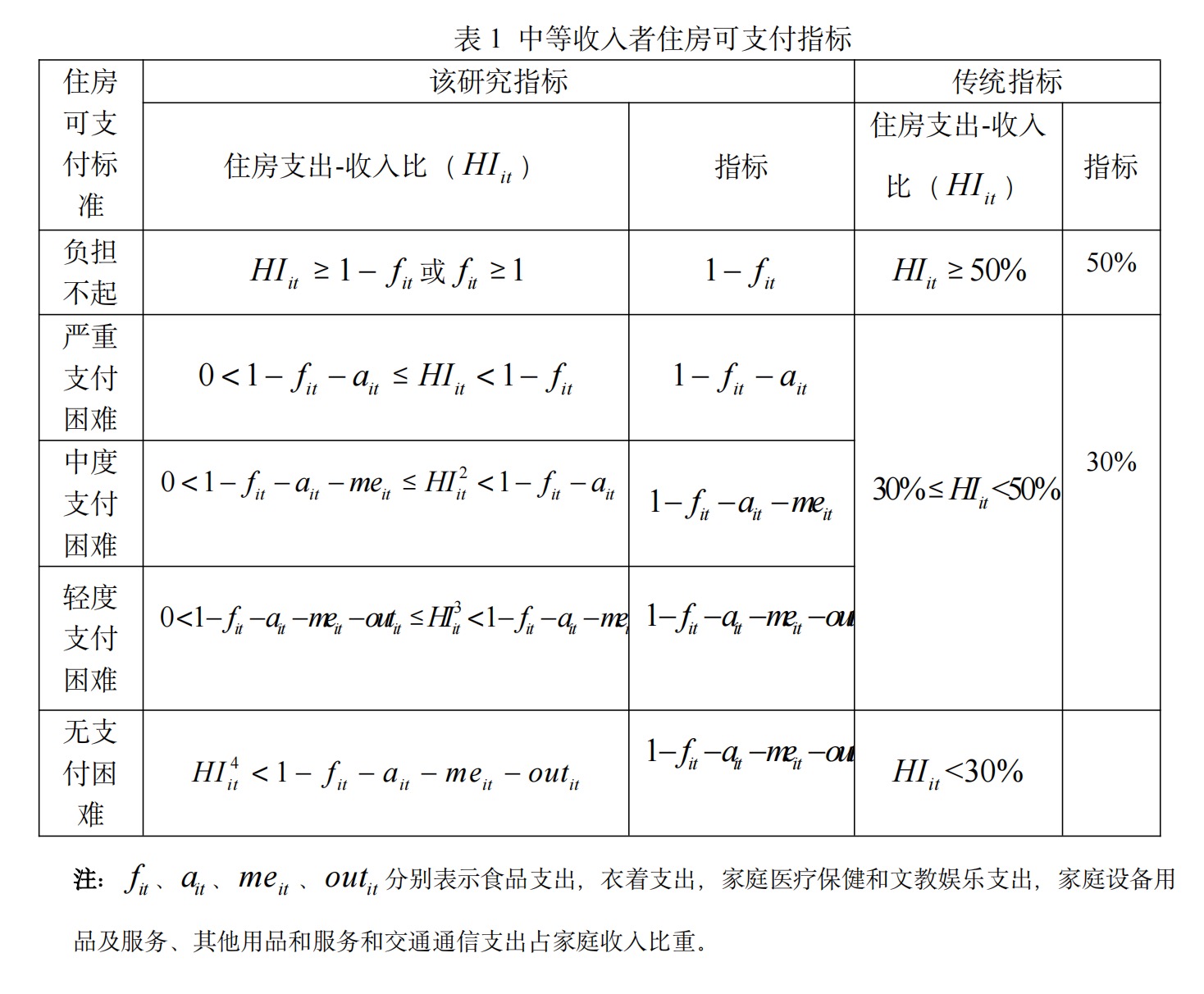 该模型基于消费收入弹性理论构建中国住房可支付指标模型。众所周知,消费收入弹性越小,消费顺序越靠前。为研究中国135个城市住房可支付指数,该研究使用2000-2022年135个城市家庭收入和消费支出数据,以1999年为基期消除通胀后,采用计量方程计算消费收入弹性(Baker,2018),得到中国135个城市家庭消费顺序如下:食品烟酒(0.52)、居住(0.66)、衣着(0.77)、医疗保健(0.84)、教育文化娱乐服务(0.99)、其他消费(1.01)、家庭设备用品及服务(1.11)和交通通信(1.19)。首先,根据中国135个城市家庭消费收入弹性,食品(“食”)为最基本消费和生存需求,居住(“住”)是比食品需求更高层次的消费和生存需求。若家庭收入不能完全满足食品需求,更无法满足住房及其他需求,住房不可支付。因此,家庭收入扣除食品支出的剩余收入占家庭收入比重()为住房负担不起理论边界值。其次,衣着(“衣”)是比食品和居住(“食”和“住”)更高层次的消费需求。若家庭收入仅能满足食品和居住需求,尚不能满足衣着需求,存在严重住房支付困难。因此,家庭收入扣除食品和衣着支出的剩余收入占家庭收入比重()为住房严重支付困难边界值。再次,医疗保健和文教娱乐是比食品、居住和衣着更高层次消费需求。若家庭收入能满足“衣、食、住”,但不能满足医疗保健和和文教娱乐需求,存在中度住房支付困难。因此,家庭收入扣除食品、衣着、医疗保健和和文教娱乐支出的剩余收入占家庭收入比重()为住房中度支付困难边界值。最后,其他消费、家庭设备用品及服务和交通通信(“行”)是比食品、居住、衣着、医疗保健和文教娱乐更高层次消费需求。若家庭收入能满足“衣、食、住”、医疗保健、文教娱乐,但不能满足其他消费、家庭设备用品及服务和交通通信(“行”)需求,存在轻度住房支付困难。因此,家庭收入扣除食品、衣着、医疗保健、文教娱乐、其他消费、家庭设备用品及服务和交通通信(“行”)支出的剩余收入占家庭收入比重()为住房轻度支付困难边界值。若家庭收入能满足“衣食住行”、医疗保健和文教娱乐、家庭设备用及服务和其他用品和服务需求,则不存在住房支付困难。表1比较该研究中等收入者住房可支付标准和传统标准,该研究发现传统30%的房租可支付指标和3-6倍房价可支付指标高估住房可支付困难程度,易引发住房保障过度问题。