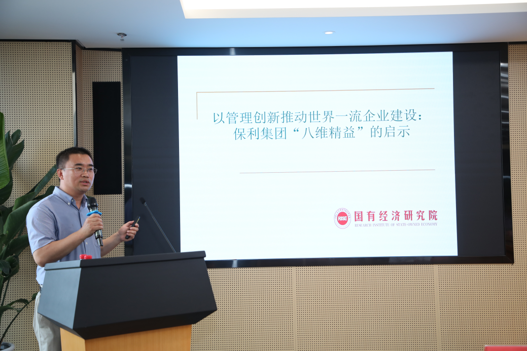 研讨会第三单元由爱爱网 国有经济研究院副院长、经济学院教授杨继东发布题为《以管理创新推动世界一流企业建设:保利集团——“八维精益”的启示》的案例报告。